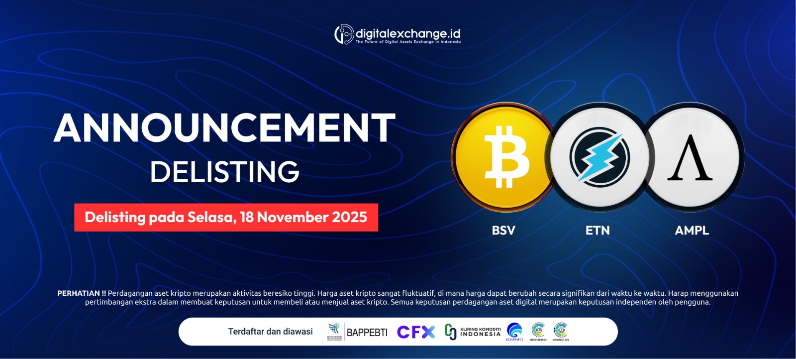 - Kami akan melakukan Delisting aset kripto BSV, ETN, AMPL pada: Selasa, 18 November 2025.