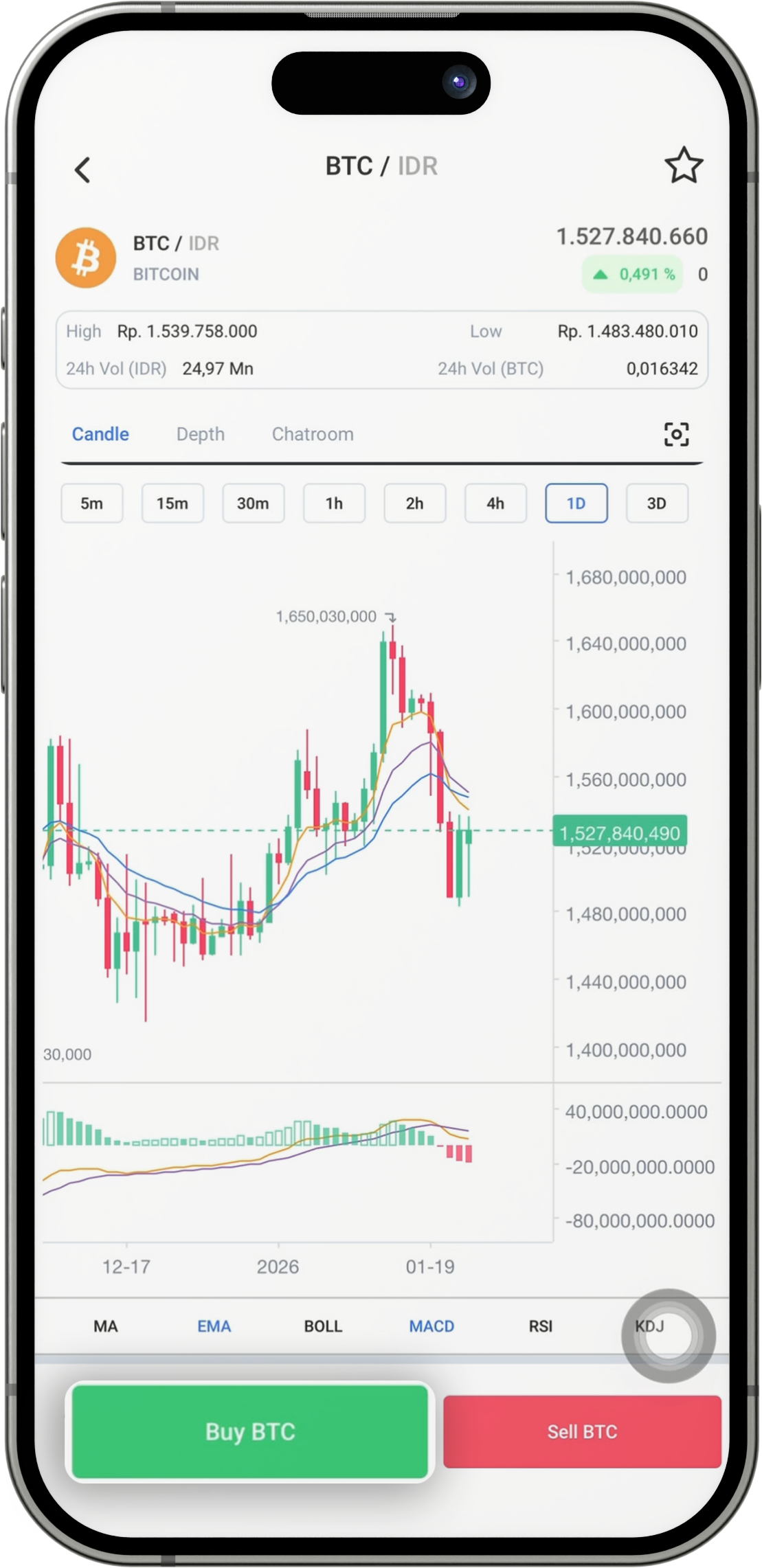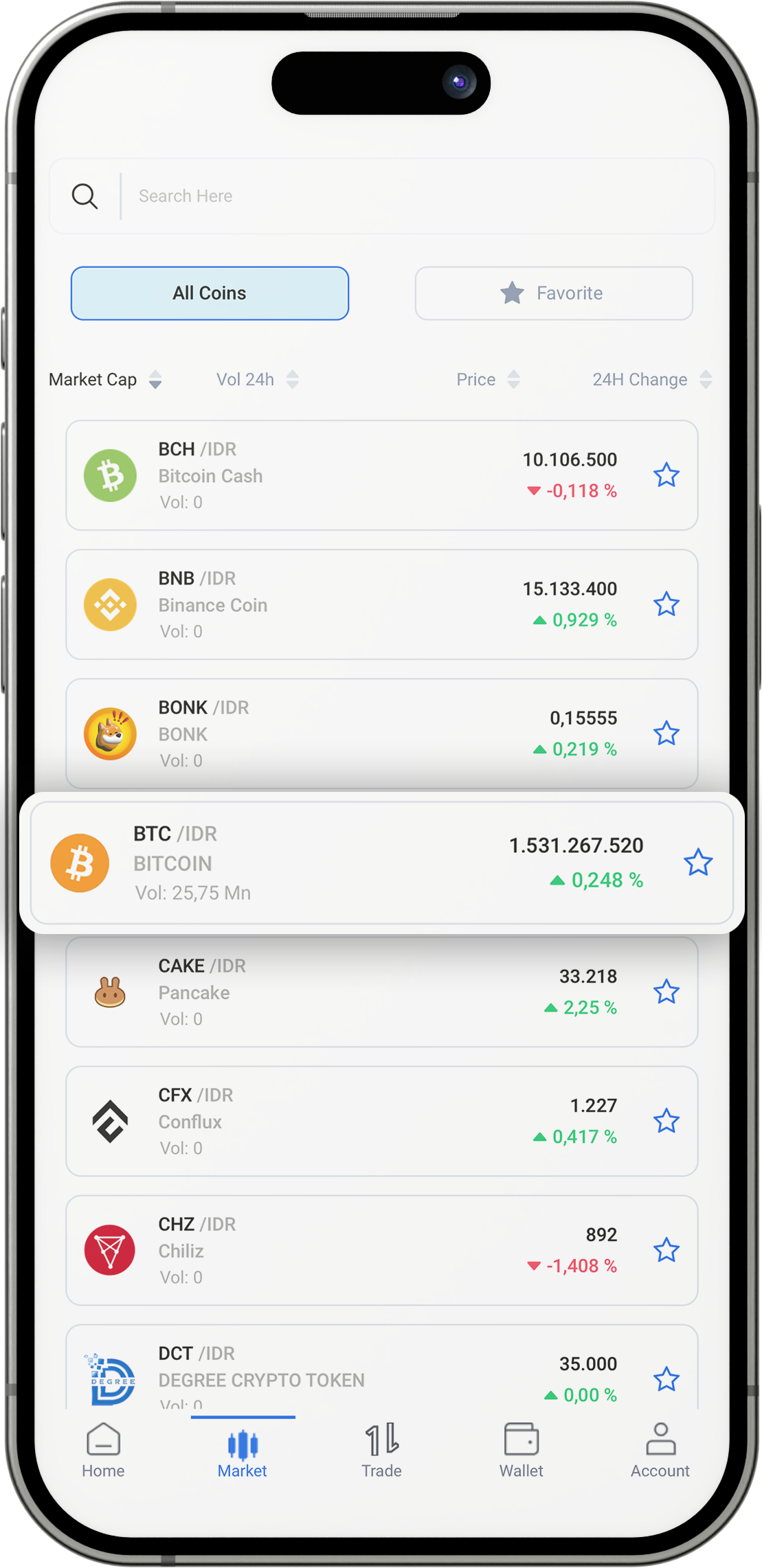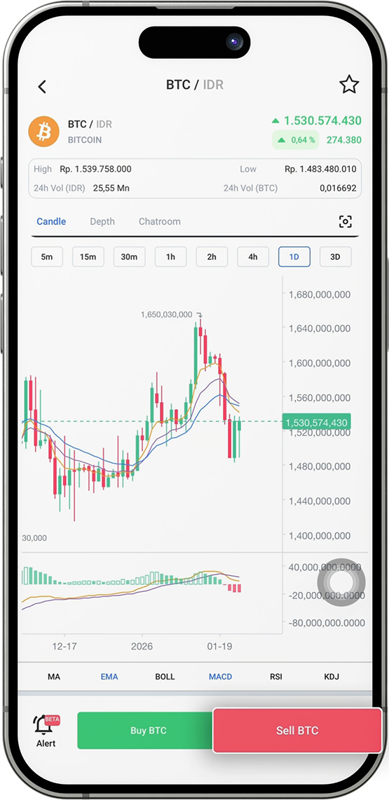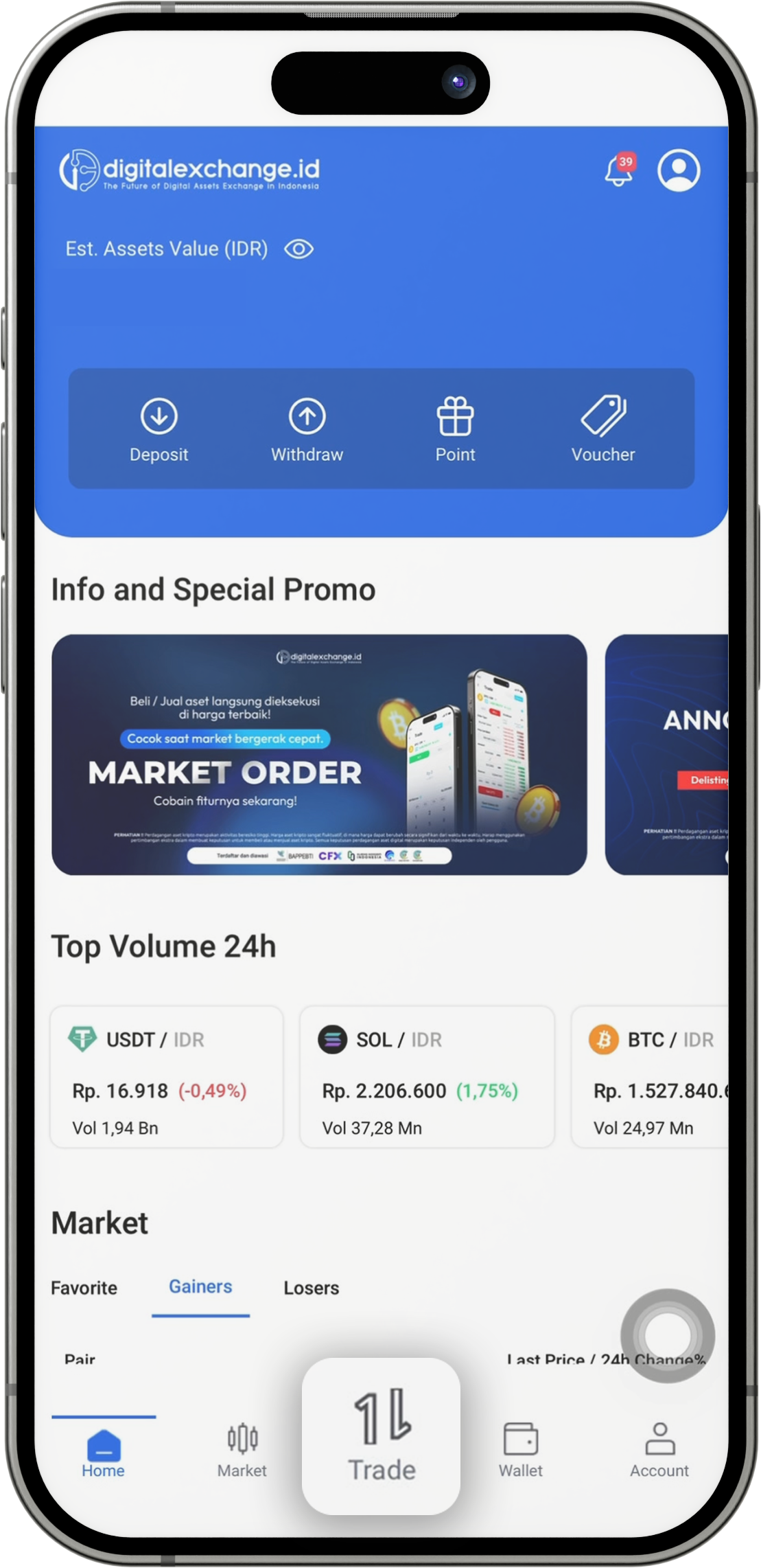 Masuk ke “Beranda” aplikasi digitalexchange.id, buka fitur Market lalu cari dan pilih aset kripto yang ingin kamu beli.