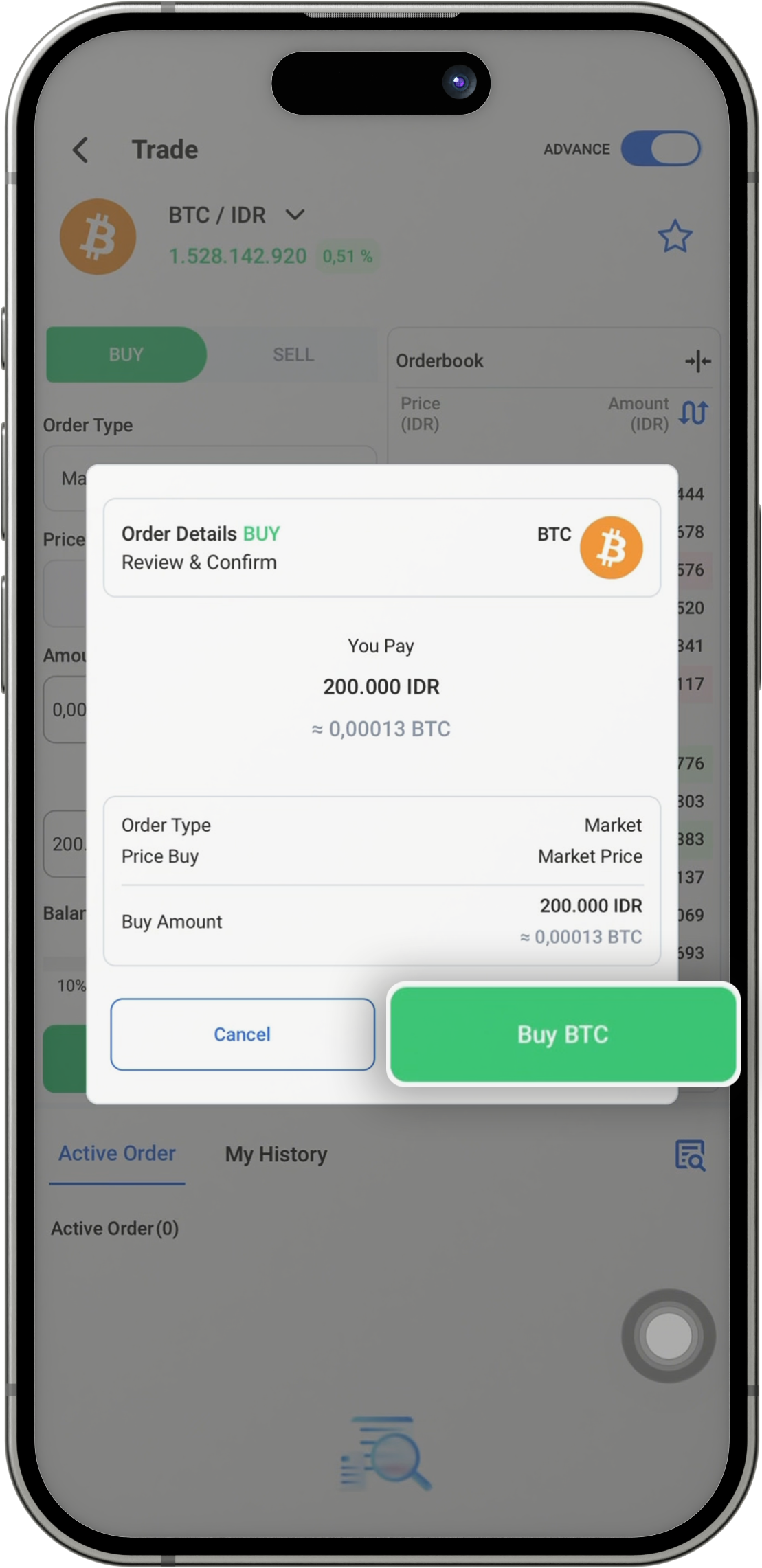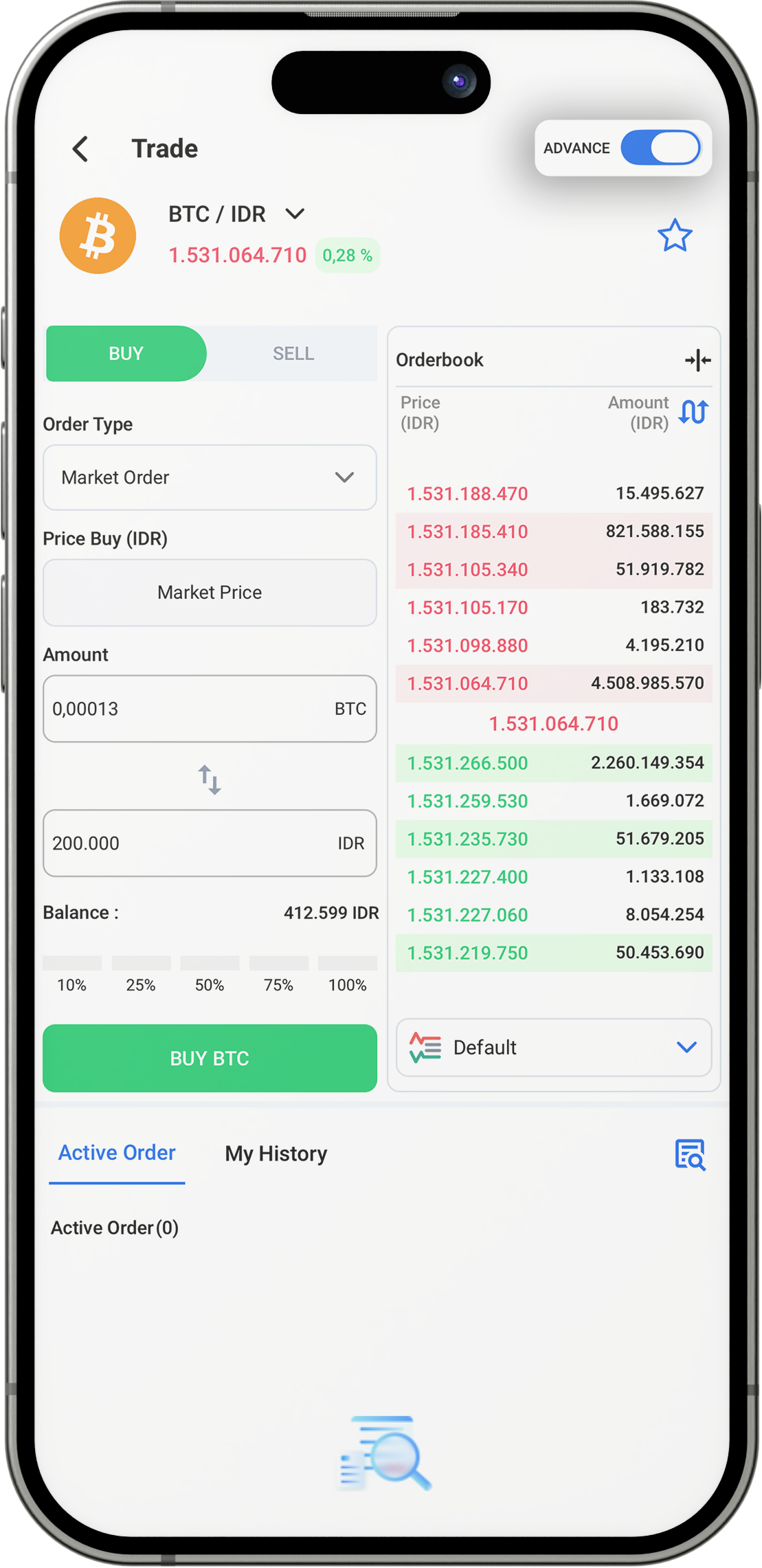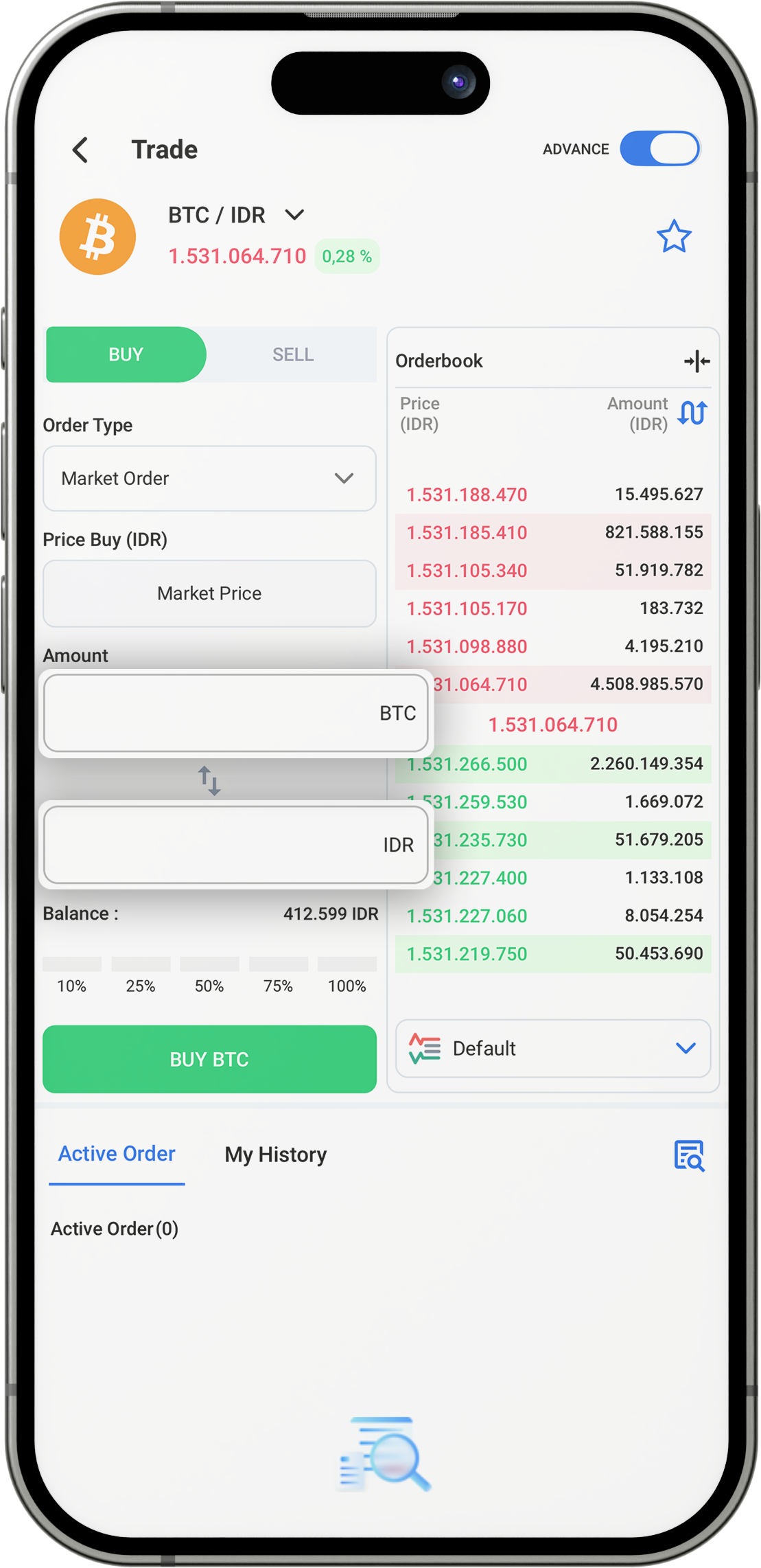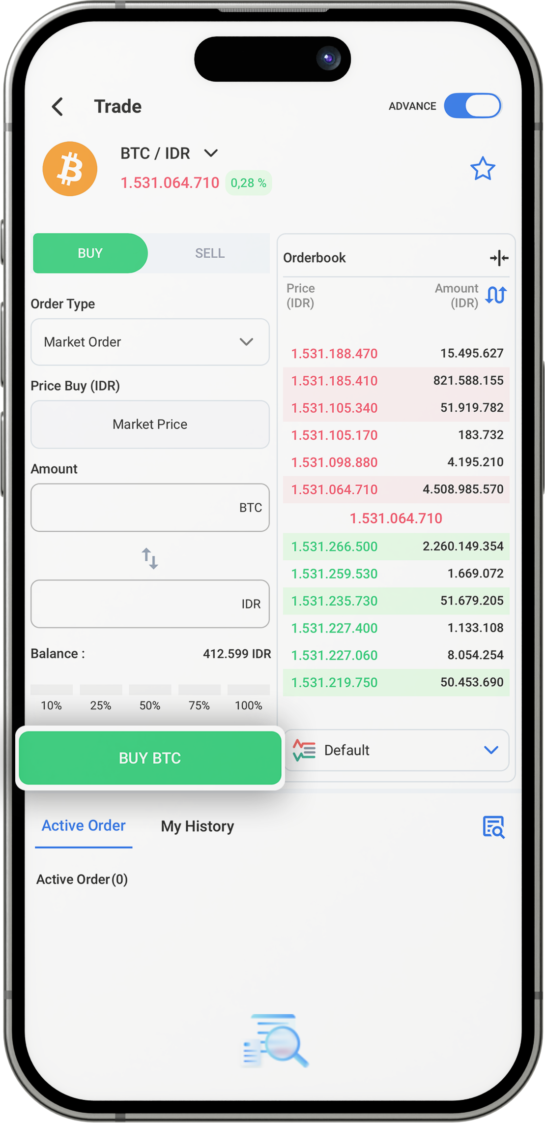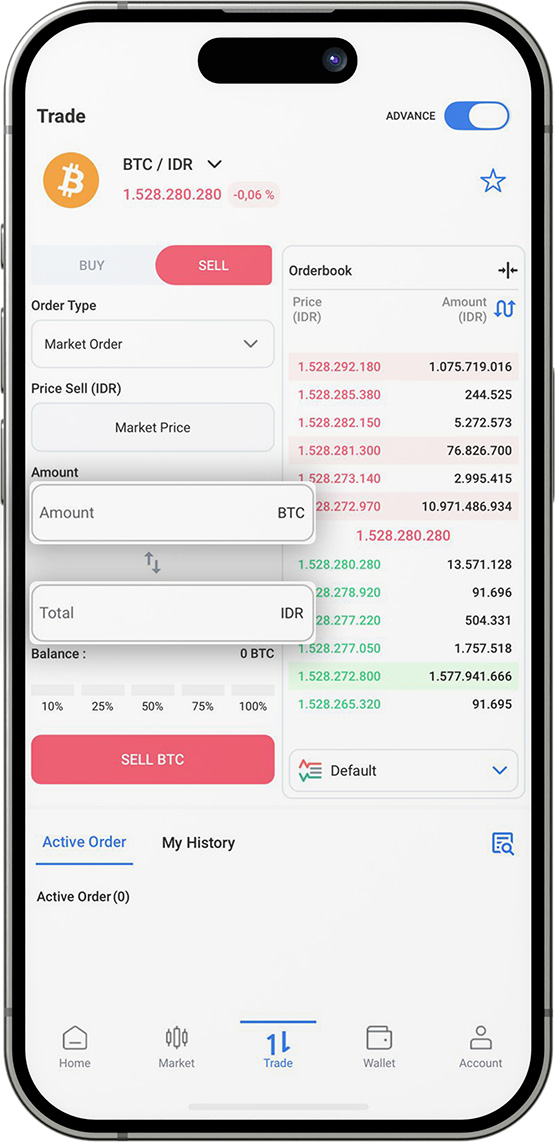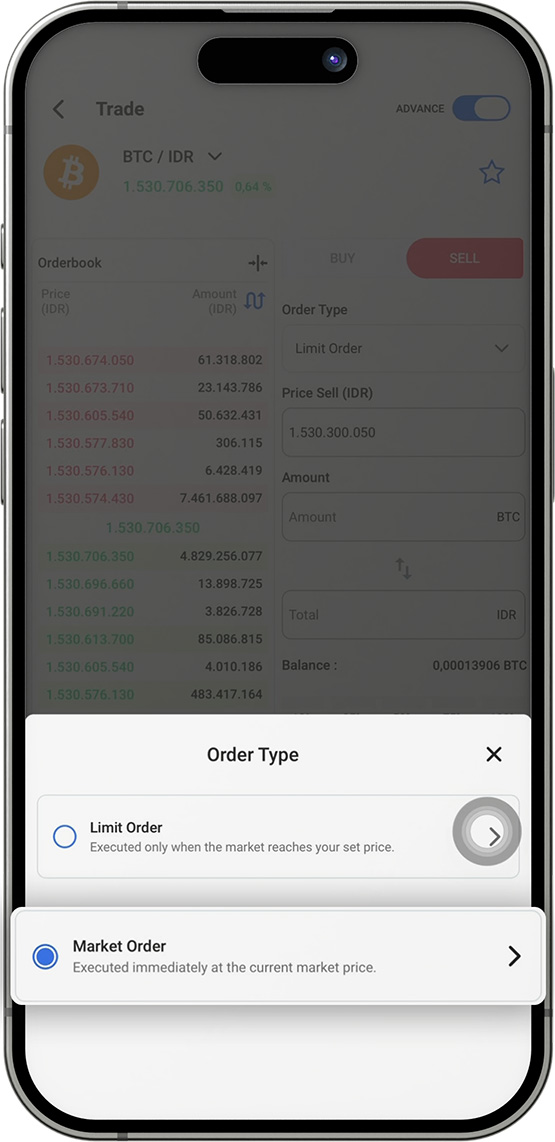 Klik Order Book lalu ubah Tipe Order menjadi “Market Order”.